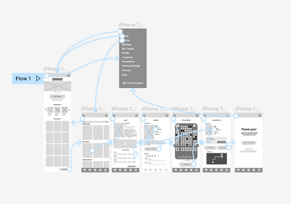 The low-fidelity prototype connects the user through the primary flow of selecting a movie, a time, and booking seats. A straightforward approach to the user flow allowed us to test the app in usability studies.